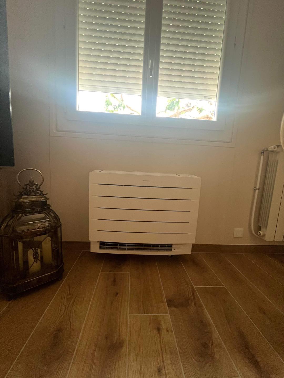 Une technologie Daikin de pointe : Daikin est reconnu pour son leadership technologique dans le domaine des pompes à chaleur. Le modèle console installé dans cette maison est à la pointe de l’efficacité énergétique, garantissant des performances optimales tout en minimisant la consommation d’énergie.